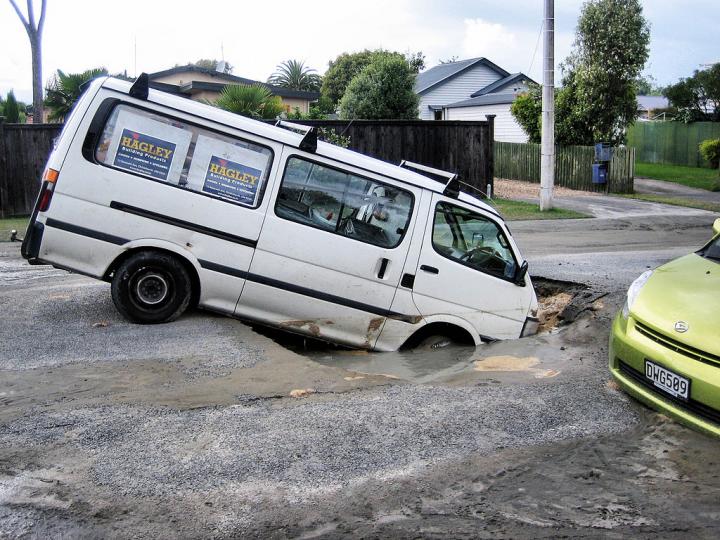 image: Sink holes and liquefaction on roads in Christchurch, New Zealand after 2011 earthquake.