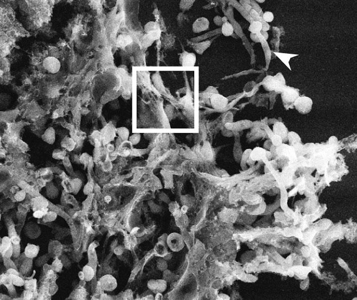 image: A scanning electron microscope image of NETs engulfing fungal cells (Candida albicans) in an infected mouse lung.