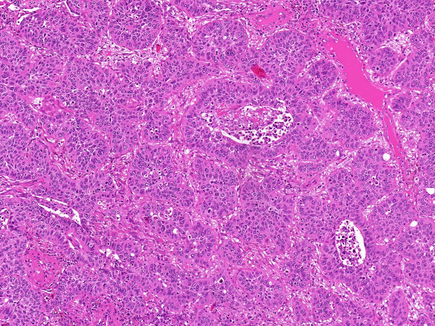 image: Under the microscope, both squamous cell carcinoma of the lung and squamous cell carcinoma of the head and neck appear as dense cell groups with non-specific growth patterns, making them impossible to distinguish based on tissue microstructure.