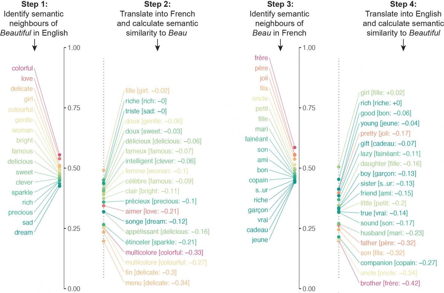 The researchers built an algorithm that examined neural networks trained on various languages to compare millions of semantic associations. The algorithm translated the semantic associates of a particular word into another language, and then repeated the process the other way around. For example, the algorithm translated the semantic associates of "beautiful" into French and then translated the semantic associates of beau into English. The algorithm's final similarity score for a word's meaning came from quantifying how closely the semantics aligned in both directions of the translation.