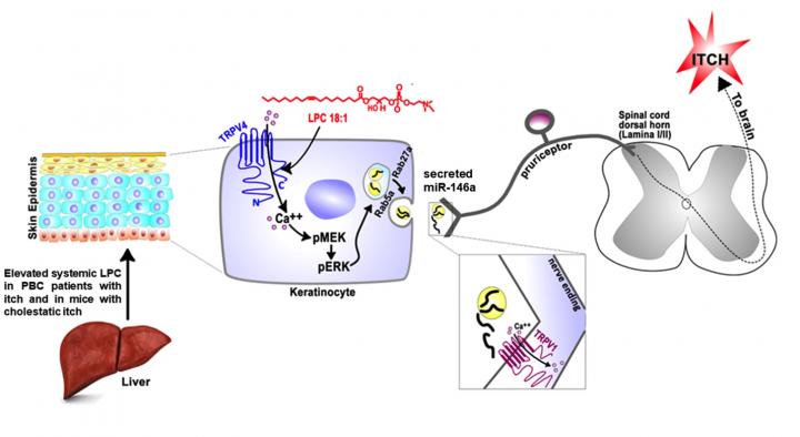 image: Excess lipids produced by liver failure signal an itching sensation directly to the skin cells, through a receptor called TRPV4 and a microRNA.