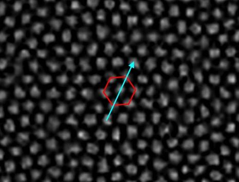 image: Image of an experimental skyrmion structure: The hexagonal arrangement and orientation are shown as an example.