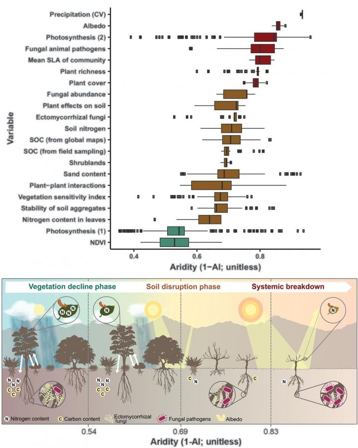 The study found for the first time that as aridity increases, dryland ecosystems undergo a series of abrupt changes. This results first in drastic reductions in the capacity of plants to fix carbon from the atmosphere, followed by substantial declines of soil fertility and ending with the disappearance of vegetation under the most arid and extreme conditions.
