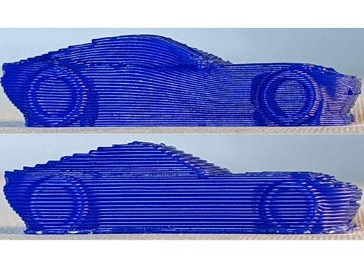 image: The top car was printed using the CurviSlicer program, while the one on the bottom was printed using a lower quality program.