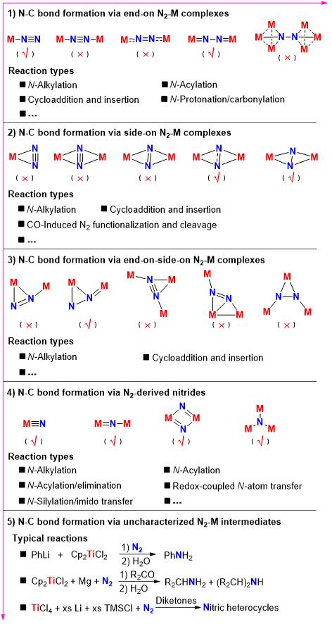 In a new review published in the National Science Review, Zhenfeng Xi et al. summarize the previous works of transition-metal mediated direct conversion of N2 into organic compounds via N-C bond formation at metal dinitrogen complexes. The review is organized by the coordination modes of the complexes (end-on, side-on, end-on-side-on, etc.) that are involved in the N-C bond formation steps, and each part is arranged in terms of reaction types (N-alkylation, N-acylation, cycloaddition, insertion, etc.) between metal dinitrogen complexes and carbon-based substrates. Besides, earlier works on one-pot synthesis of organic compounds from N2 via ill-defined intermediates are also briefed by the authors.