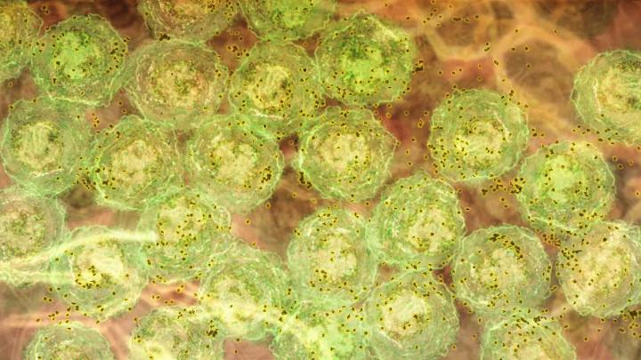 The research team showed, in laboratory models, that strong inflammatory signals caused by malaria infection activate molecules that trigger B cells to produce highly potent antibodies to fight the disease. In this image, we see B cells (green) producing antibody (brown).