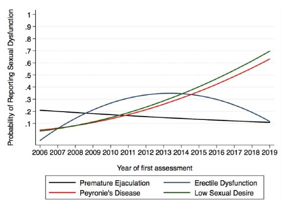 There were comparatively few patients complaining of low sex drive or Peyronie's disease in 2009, but complaints about both of these conditions grow from 2009 to the end of the study. In 2019 men were around 30% more likely to report Peyronie's disease than in 2009, and around 32% more likely to report low sexual desire.