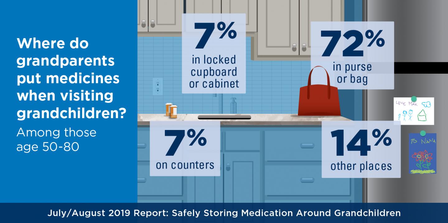 And when grandparents visit their grandchildren, the chance of easy access may go up, the poll suggests. Nearly three-quarters of grandparents say they keep their medicines in their bag, and 7% leave them on a counter or table. Only 7% placed them in a locked cupboard or cabinet.