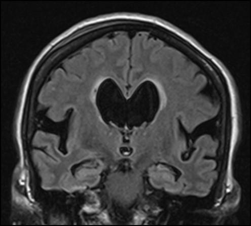 image: Idiopathic normal pressure hydrocephalus is characterized by enlarged ventricles of the brain and obliterated parasagittal sulci.