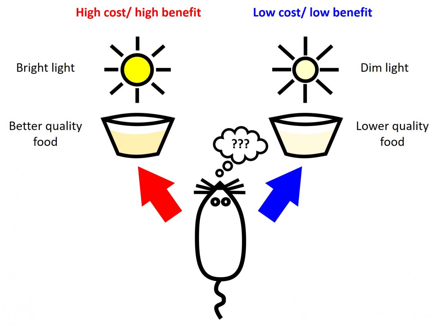 image: In a simple behavioral experiment, rats choose between better quality food that is delivered in conjunction with an uncomfortably bright light, or lower quality food with a less bright light. Signals from the ventromedial thalamus may affect which choice the rats make.
