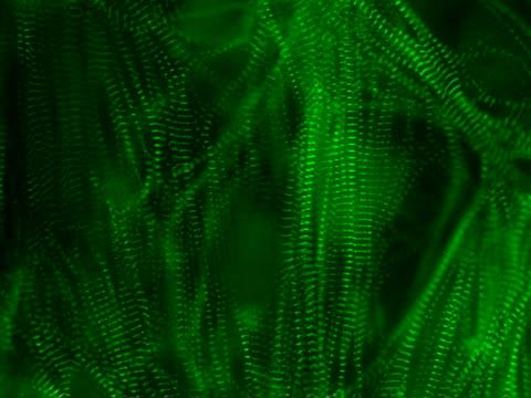 video: In these beating human heart cells, scientists have highlighted a protein important in muscle contraction (green). A new cell atlas reveals this protein and others in different heart cells' locations.