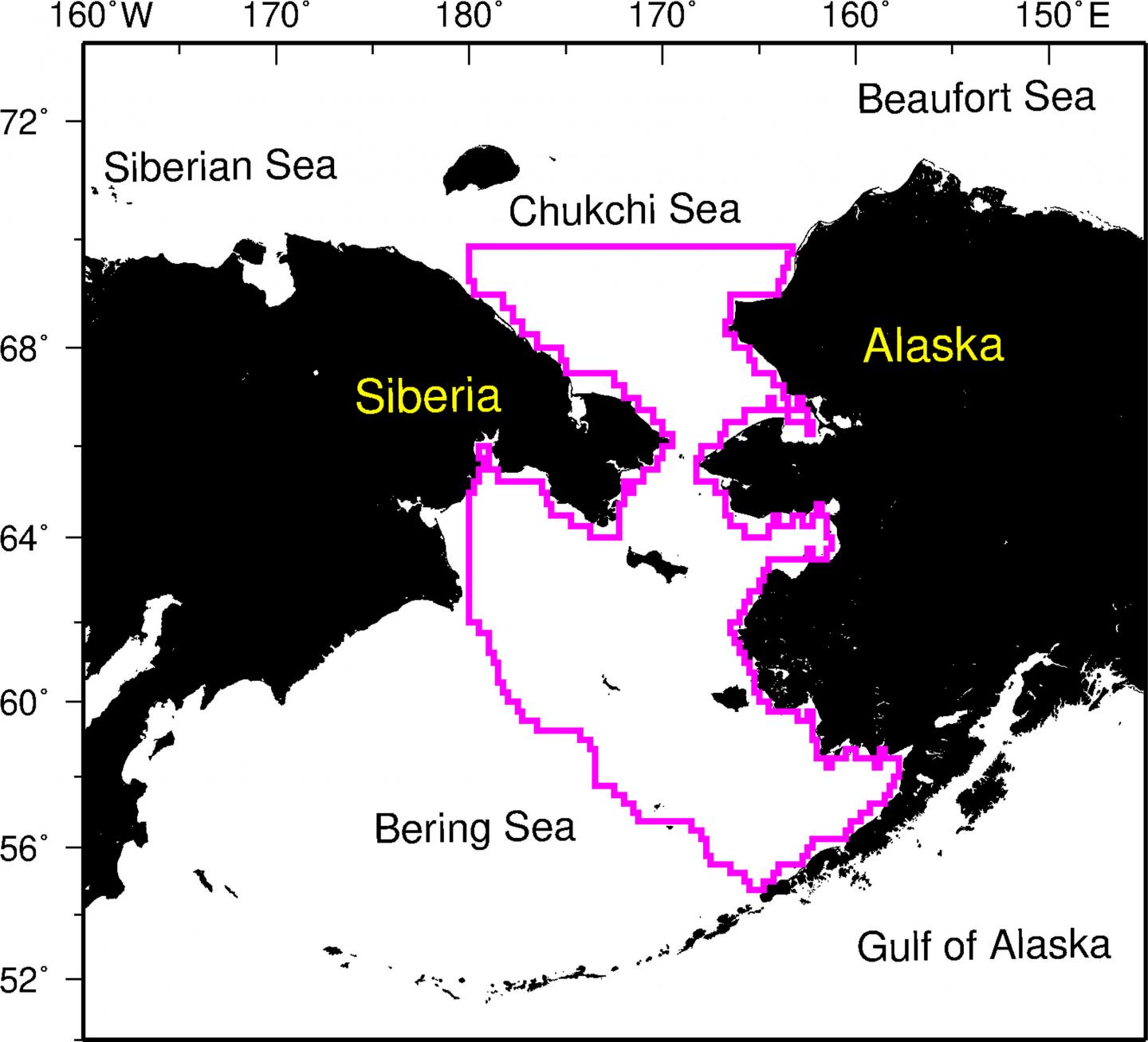 image: Geographic map of the Pacific Arctic region, highlighting the study area in purple contour. (Irene D. Alabia, et al., Science of The Total Environment, supplementary file, July 15, 2020).