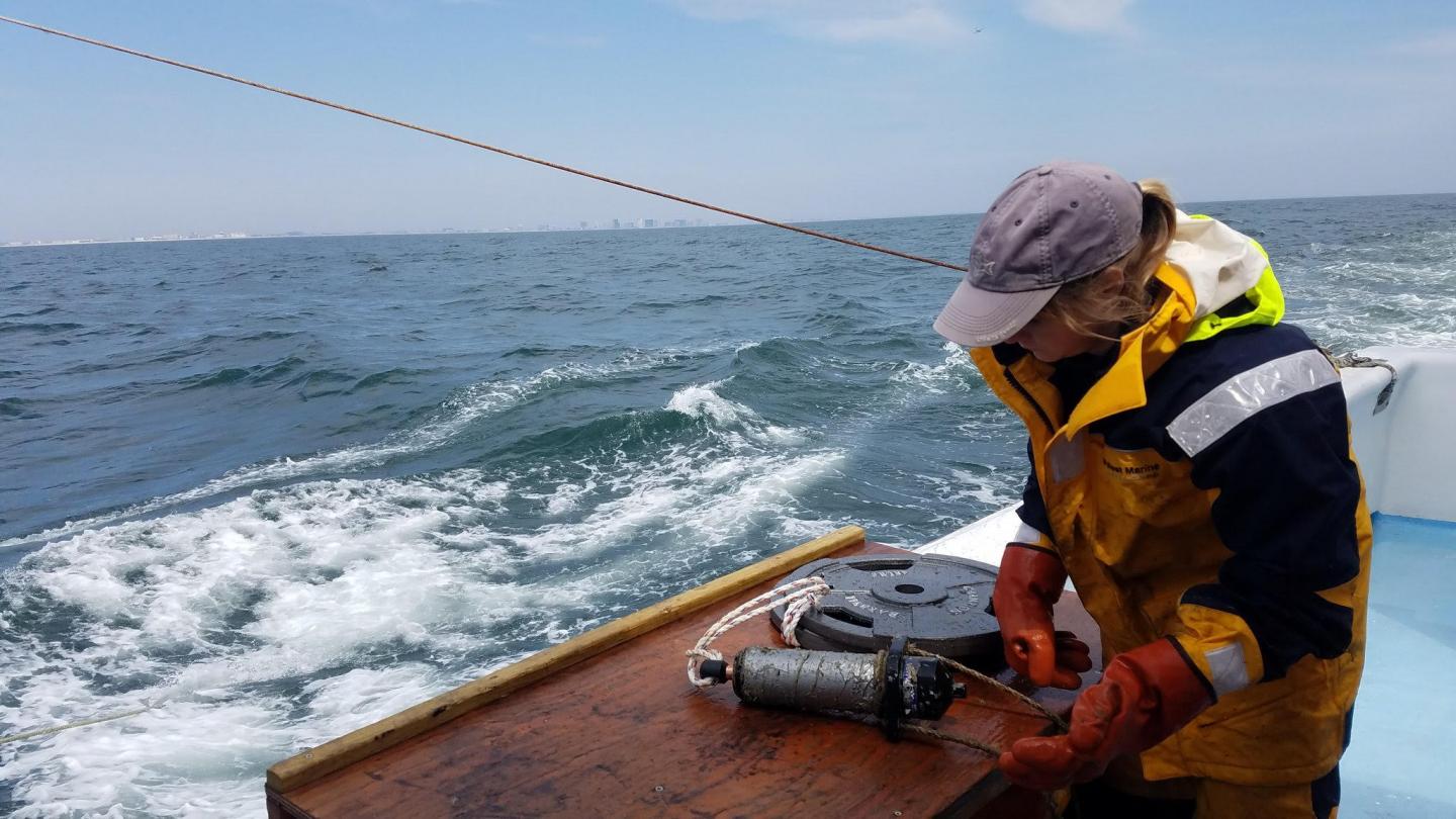 image: Researcher Ellie Rothermel configures an acoustic receiver off coast of Ocean City, Maryland, to monitor to the movement of Atlantic sturgeon and striped bass off the Delmarva coastline.