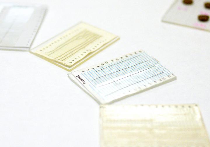 image: Hair samples from the victim are mounted on slides for analysis by mass spectrometry.