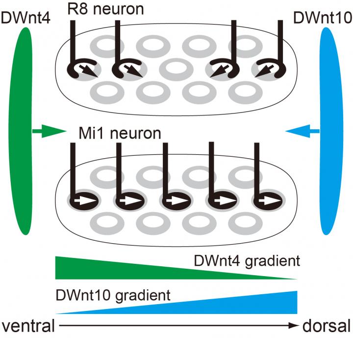 Makoto Sato and his co-workers have previously revealed three neurons types--R7, R8 and Mi1-- to comprise the columns. Thus, they then investigated the role of Wnt/PCP in these neurons. Switching PCP off resulted in the Mi1 and R8 neurons changing direction, confirming that orientation was controlled by this pathway. On the other hand, when Wnt signaling was turned off the Mi1 neurons also showed structural impairment. Wnt/PCP was, therefore, instrumental to proper spatial and structural development of the columns.