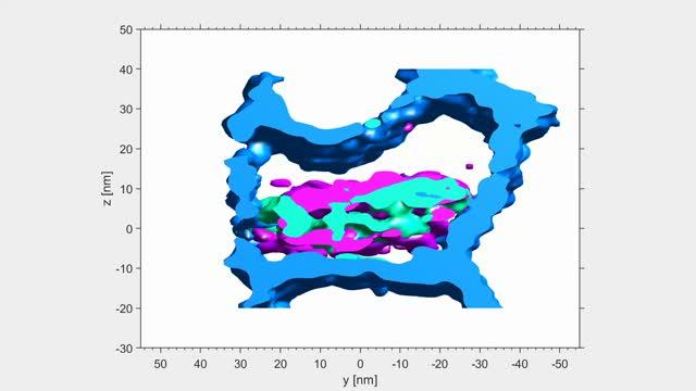 video: A rotating view of the "world's tiniest sandwich." Magnesium ions (magenta) form two layers on either side of the enamel crystallite's core, just 6 billionths of a meter across. Sodium (turquoise) and fluorine (blue) also are represented in the video created from data acquired by atom probe tomography.