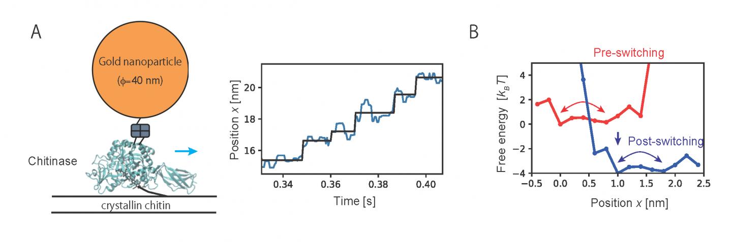 image: Fig. 2. (A) Unidirectional motion observed by single-molecule imaging of chitinase. (B) Chemical-state-dependent free energy profiles estimated from the imaging data.