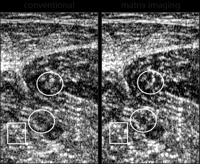 image: Conventional and matrix ultrasound images of a volunteer's calf. Matrix correction of aberrations reveals structures that were previously invisible or had poor resolution in a conventional ultrasound (especially in the areas inside the white lines)