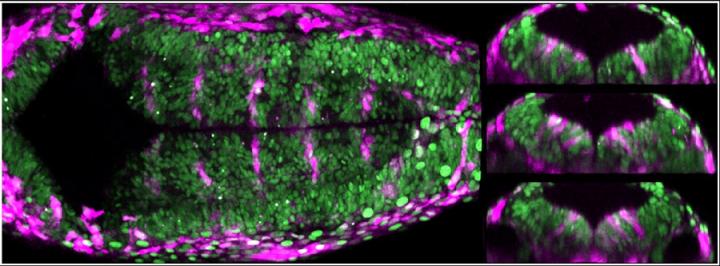 image: Dorsal view of the posterior brain of a transgenic zebrafish embryo in which all cell nuclei are green and cells that respond to mechanical signals are magenta. On the right, the cross sections are seen across the borders where the sensor cells of the mechanical changes in magenta are seen.