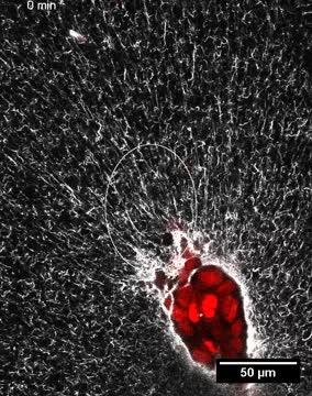 video: Through time-resolved observation of the cells, a research team at the Technical University of Munich was able to investigate the complex interactions between the organoid cells and the surrounding collagen matrix in detail. By expanding in the direction of movement and then contracting again, the cells generate forces that deform the surrounding collagen matrix, making it possible for the organoid to organize the direction of its own further growth.