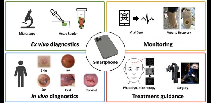 image: Smartphone-based imaging for various biomedical applications grouped into four clinical workflows.