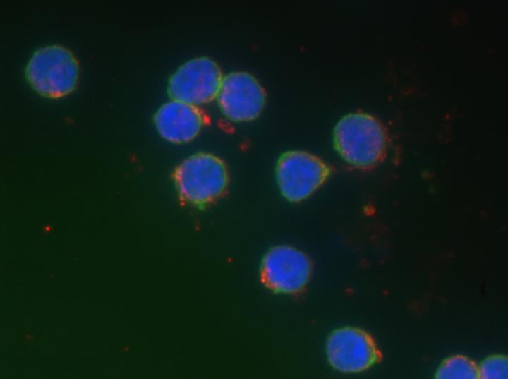 image: B lymphocytes (blue and green) and gold nanoparticles (red) measured with dark field hyperspectral imaging coupled with fluorescent detection.