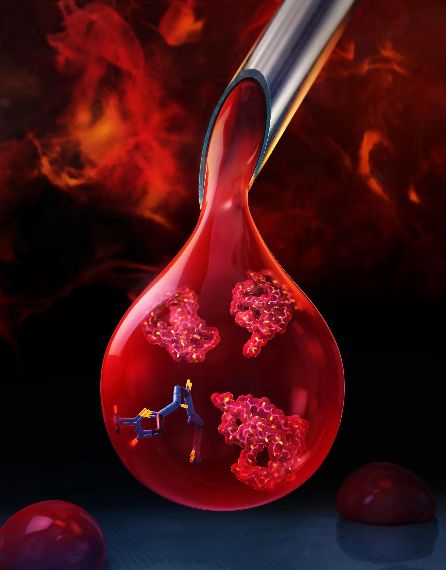 image: Artistic representation of protein-drug interaction in a blood sample.