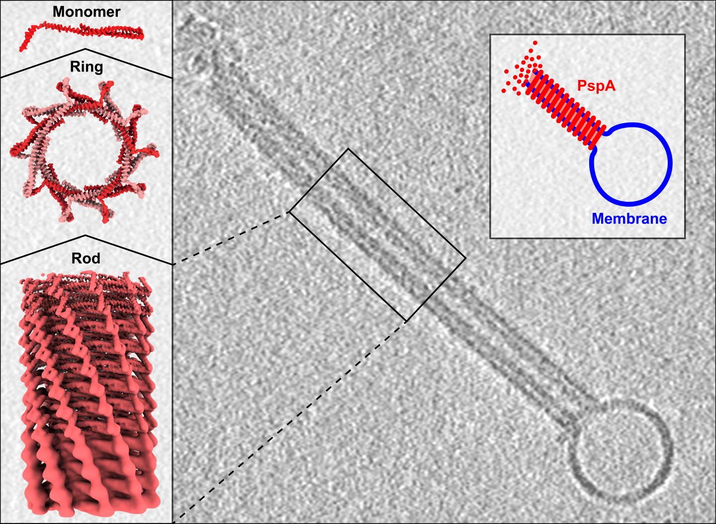 Under the microscope, the researchers were able to recognize or - in jargon - "resolve" the structure of PspA. The structure of a protein is essential for its function and a defect in the structure can impair the protein function. "Under the microscope, we realized that PspA has a structure similar to ESCRT-III proteins, which our laboratory had already been working on. This came as a complete surprise and showed how important it is to elucidate protein structures in detail," said Sachse. "After billions of years, the two groups of proteins have genetically diverged so far that their similarities could only be detected based on their structure."