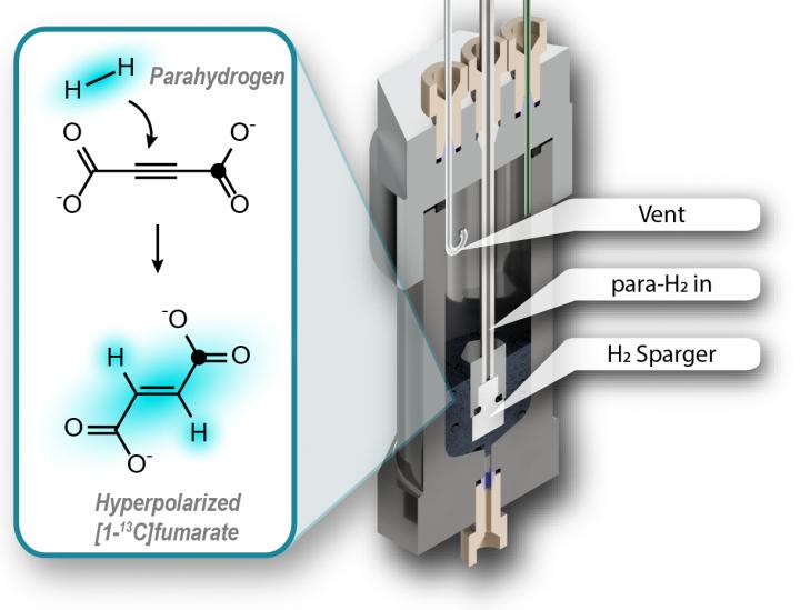 Hyperpolarized fumarate is a promising biosensor for the imaging of metabolic processes. Fumarate is a metabolite of the citric acid cycle that plays an important role in the energy production of living beings. For imaging purposes, the fumarate is tagged with carbon-13 as the atomic nuclei of this isotope can be hyperpolarized. Dynamic nuclear polarization is the current state-of-the-art method for hyperpolarizing fumarate, but this is expensive and relatively slow. The equipment required costs one to two million euros. "Dynamic nuclear polarization is very difficult to use in everyday clinical practice due to the related high costs and technical complexity. Using parahydrogen, we are able to hyperpolarize this important biomolecule in a cost-effective and convenient way," said Dr. Stephan Knecht of TU Darmstadt, the first author of the published article.