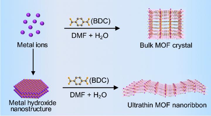 image: Comparison of the traditional approach for preparation of bulk MOF crystal (top) and metal hydroxide nanostructure precursor approach for synthesis of ultrathin MOF nanoribbon (bottom).