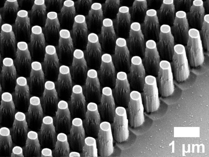 image: This is a zoomed-in SEM image of nanopillars of the metalens.