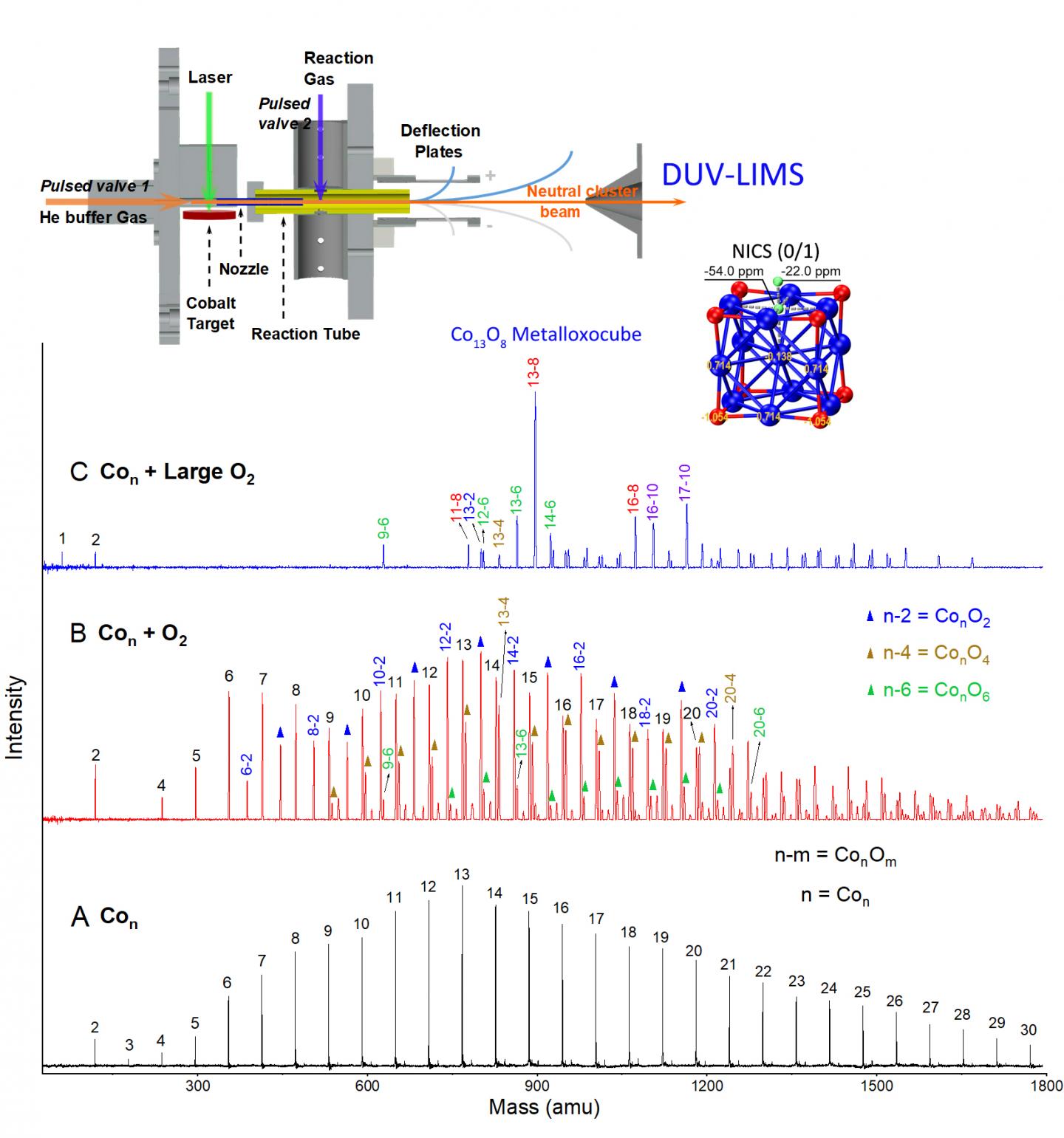 Using the home-made deep ultraviolet laser ionization mass spectrometry (DUV-LIMS) with high ionization efficiency of neutral cobalt clusters, they observed the reactions of Con (n=2-30) with oxygen. Interestingly, a particularly stable species, Co13O8, shows dominant mass abundance in the presence of a large flow rate of oxygen gas (as shown in the Figure below).