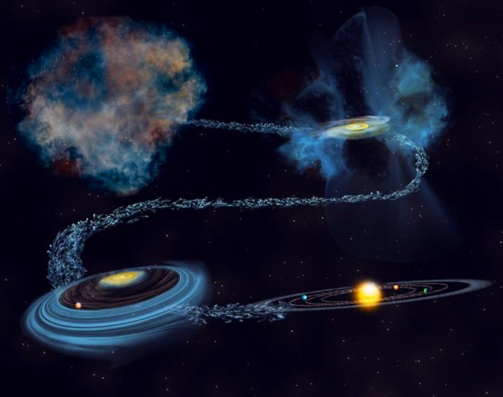 image: Artist illustration of the formation of the solar system, capturing the moment where radioactive nuclei got incorporated into solids that would become meteorites.