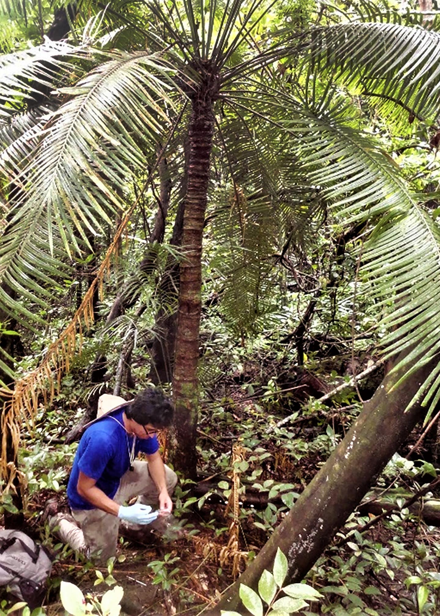 image: University of Guam Research Associate Benjamin Deloso collects soil samples beneath a Cycas micronesica tree on the Micronesian Island of Yap. Scientists from Guam and Yap were among a team of authors who published the first-ever review of literature on leaf nutrient relations of cycads.