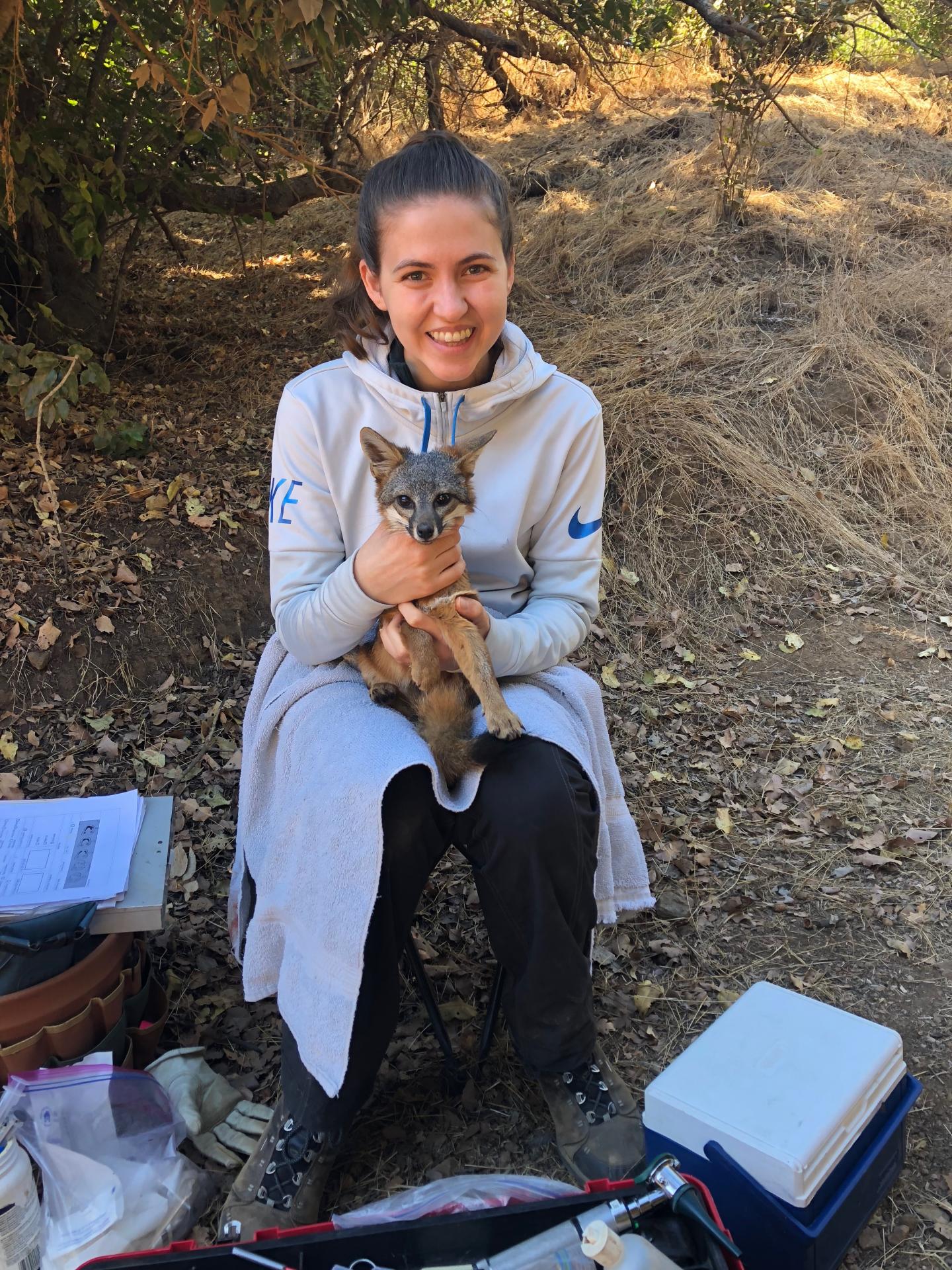 image: In the threatened Santa Catalina foxes, staph microbes have been linked to cancer, report a team of Princeton researchers. Here, Princeton University graduate student Alexandra DeCandia, first author on the new study in Molecular Ecology, holds one of the cat-sized Santa Catalina foxes that was swabbed as part of the Catalina Island Conservancy's population monitoring efforts. Co-author Lara Brenner had already assessed the health of this fox, collected microbial samples and treated his ear canals with Ivermectin to protect against mite infestations.