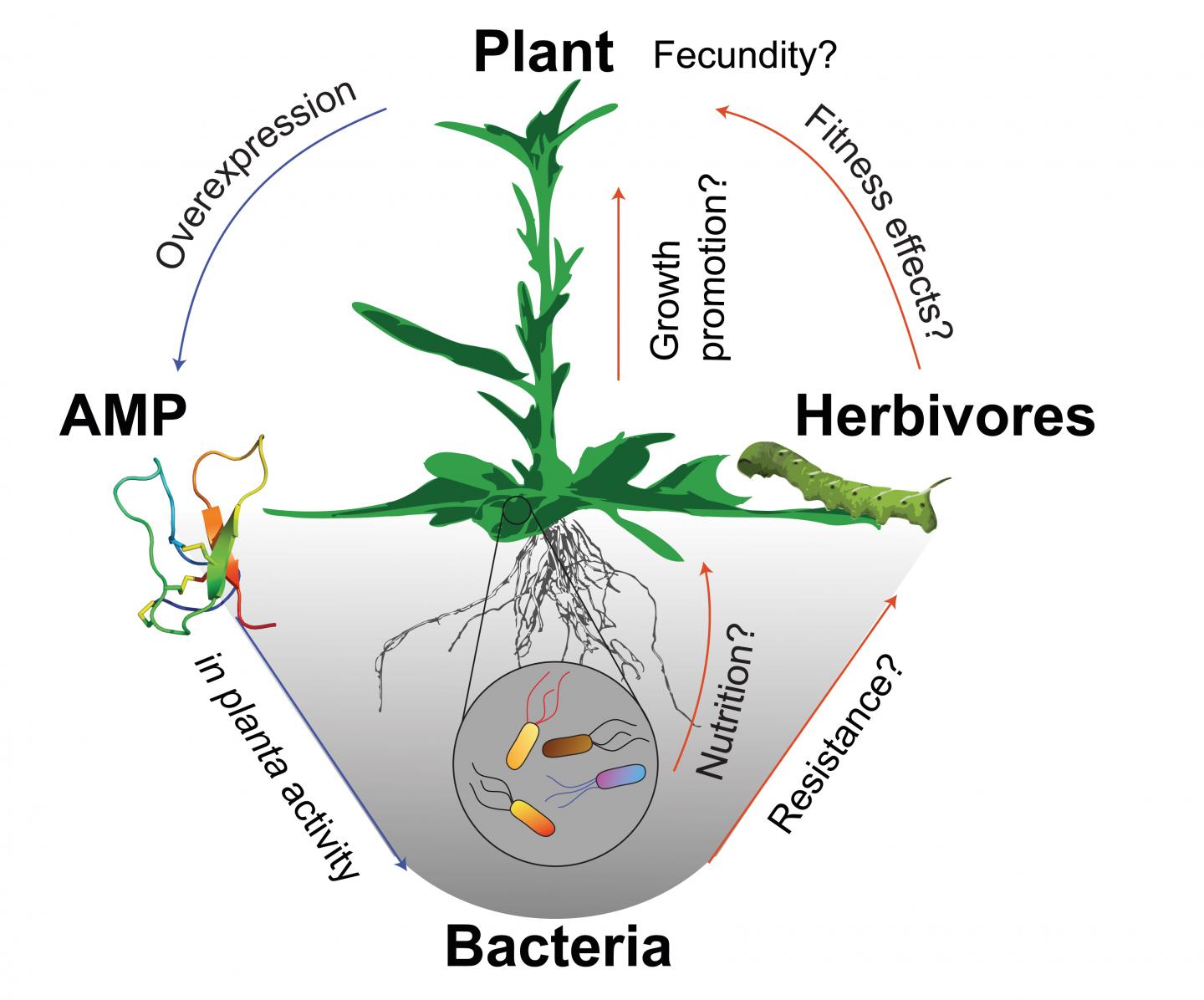 image: Which impact do bacteria, which have been recruited by a plant from the soil, have on plant performance in nature (here: coyote tobacco Nicotiana attenuata)? Can they improve nutrient uptake, do they increase growth and fecundity? Can they provide resistance against the attack of herbivores, such as the tobacco hornworm Manduca sexta? And what happens if plants producesexpress antimicrobial peptides (AMP) which target specific bacterial partners? The results of the study show that AMP activity leaves the plants and their bacterial partners largely unimpressed.