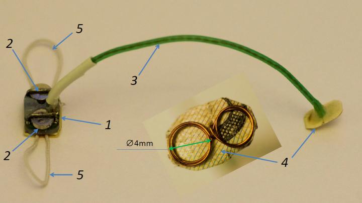 image: Portable device for local application of oscillating magnetic fields: 1 - generator; 2 - batteries; 3 - connecting cable; 4 - magnetic coil; 5 - loops for attaching the device on the back of the bird.