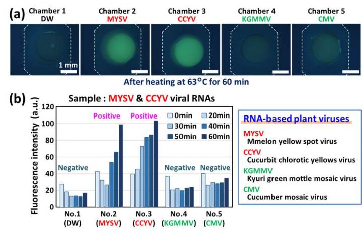 Here, our research team has solved this problem by employing microfluidic chip technology. We have developed a polydimethylsiloxane (PDMS)-based microfluidic device for the multiplex genetic diagnosis of plant diseases by using semiconductor manufacturing technology. The fabricated multiplex genetic diagnostic device consists of an array of five reaction chambers (3 μL in volume) and a microchannel (200 μm in width and 80 μm in height) forming a network connecting them. The device was approximately 45 mm×25 mm in size (less than 1/3 of name card). As a sample, total RNA containing viral RNA target extracted from diseased cucumber leaves collected at a farm was used. In the operating procedure for the multiplex LAMP assay, a mixture of sample and reagents were autonomously dispensed into the multiple reaction chambers, with just one operation for introducing the mixture into the inlet port of the device. Then, the device was heated in hot water (63ºC for 40 minutes to 1 hour), resulting in the specific amplification of targeted nucleic acids. As shown in the figure, two kinds of RNA viruses were successfully detected simultaneously on our diagnostic device. It should be noted that the device has the ability to simultaneously diagnose up to four different kinds of plant viral diseases.