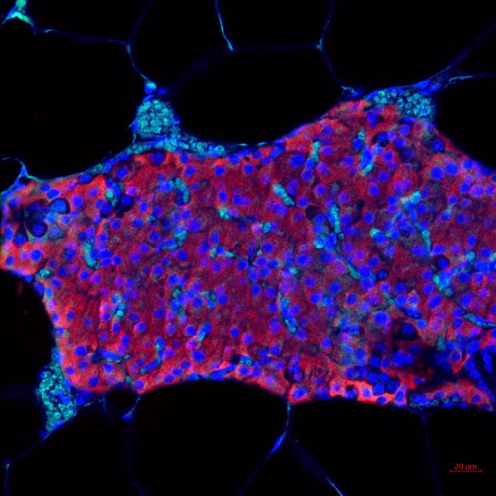 image: Transplanted pancreatic islet cells in which insulin is shown in red, the cell nucleus in blue, and the blood vessels in aqua.