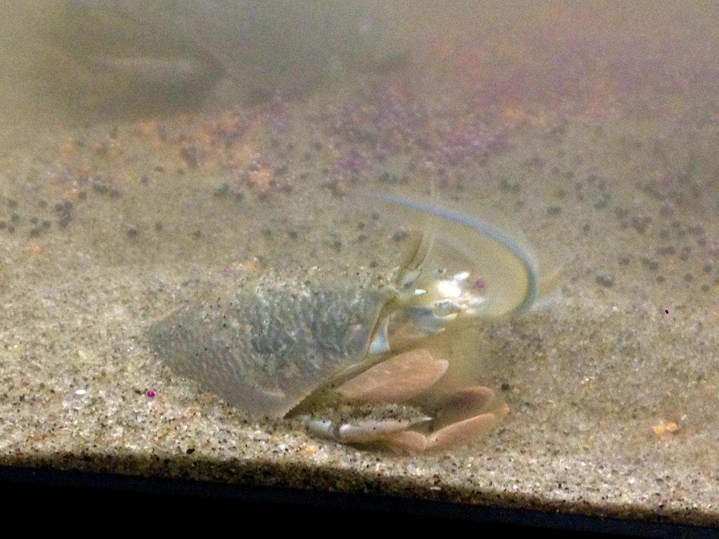 image: A Pacific mole crab, or a sandcrab, in an aquarium. You can see the feeding appendages are out feeling for food in the water. PSU researcher Dorothy Horn examined the effects of exposure to microfibers on adult mortality, reproductive output and embryonic development of the sand crab.