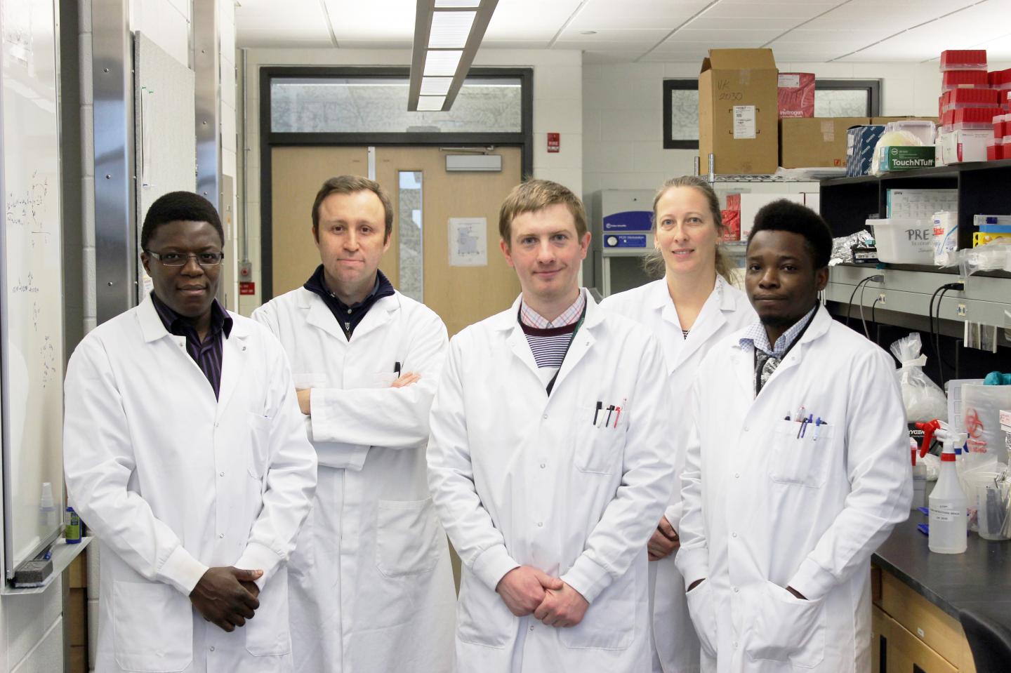 image: Left to right: Henry Munyanduki (post-doctoral fellow), Uladzimir Karniychuk (senior author), Ivan Trus (post-doctoral fellow), Nathalie Berube, (technician), Daniel Udenze (master's student)