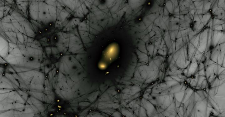 image: A still image from a simulation of the formation of dark matter structures from the early universe until today. Gravity makes dark matter clump into dense halos, indicated by bright patches, where galaxies form. In this simulation, a halo like the one that hosts the Milky Way forms, and a smaller halo resembling the Large Magellanic Cloud falls toward it. SLAC and Stanford researchers, working with collaborators from the Dark Energy Survey, have used simulations like these to better understand the connection between dark matter and galaxy formation.
