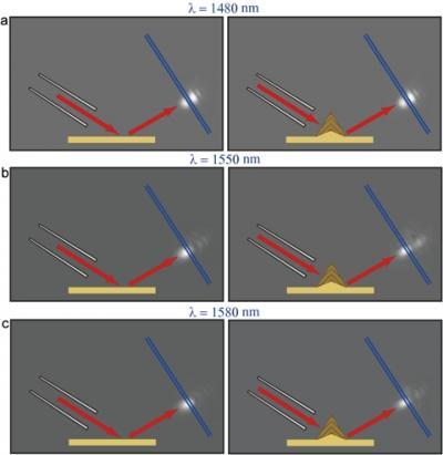 The measured output image from a flat surface (left) and a cloaked protruded surface (right) at 1,480 nm (a), 1,550 nm (b), and 1,580 nm (c).