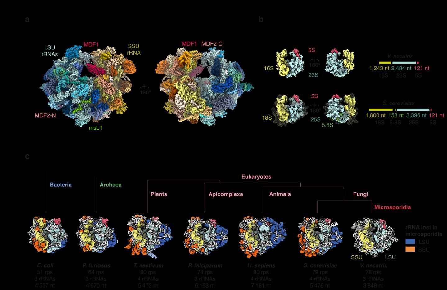 image: Picture: a) The cryo-EM density of the microsporidia ribosome solved by Jonas Barandun and his colleagues. The large ribosomal subunit is colored in shades of blue and green while the small ribosomal subunit is colored in shades of yellow and orange. Novel identified factors MDF1 and MDF2 are labeled. b) The microsporidia ribosomal RNA compared with yeast rRNA. The bar to the right compares the stretched RNA in length. c) A comparison of ribosomal structures of the microsporidium V. necatrix (to the right) with selected structures from major branches of the tree of life. Organism names are indicated below (P. falciparum: Malaria parasite, H. sapiens: human, S. cerevisiae: yeast, fungi). Ribosomal RNAs are depicted in light-blue (LSU, large subunit) and yellow (SSU, small subunit). Elements that are not present in microsporidia are colored in orange and dark-blue.