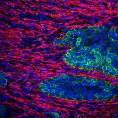 image: Immunofluorescence staining image of the 3D fibrotic tissue. Cancer cells (green) exist embedded within a densely fibrotic extracellular matrix (red). Cell nuclei are stained in blue.