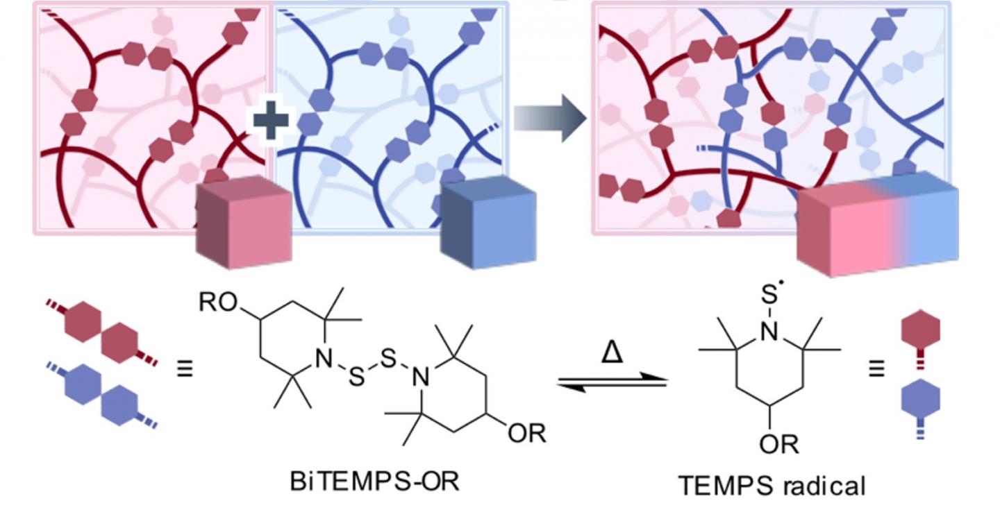 image: The proposed BiTEMPS linkers become cleaved at the S-S covalent bond at >80°C. After cooling, the TEMPS radicals join once again, allowing for the fusion of different cross-linked polymers.