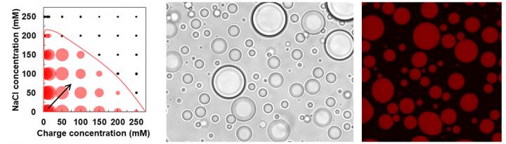 The researchers make membraneless compartments, which form through liquid-liquid phase separation in a manner akin to oil droplets forming as a salad dressing separates, by controlling the concentrations of reagents in a solution. When the conditions--pH, temperature, salt and polymer concentrations--are right, droplets form that contain higher concentrations of the polymers than the surrounding solution. Like oil drops in water, there is no physical barrier or membrane that separates the droplets from their surroundings.