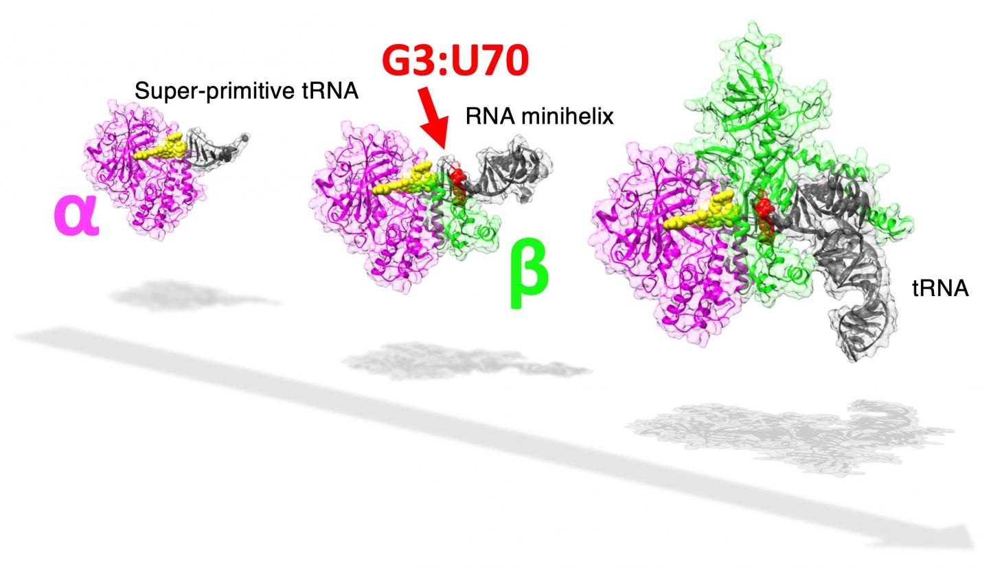 The researchers noticed that, at a relatively high concentration, AlaRS-α alone was capable of adding alanine to both tRNAAla and minihelixAla. Then also observed that AlaRS-α alone interacts with the end of the alanine-accepting region of tRNAAla, but not with the G3:U70 base pair. This was in stark contrast to prior knowledge regarding tRNAAla and AlaRS system. In brief, when both AlaRS-α and AlaRS-β were present, AlaRS behaved in a G3:U70-dependent manner, but working alone, AlaRS-α could add alanine to tRNAAla and minihelixAla in a G3:U70-independent manner. The researchers deduced that "the G3:U70 may be a late-arriving 'operational RNA code,' relevant to later alanylation systems incorporating further specificity through the evolution of the AlaRS-β subunit."