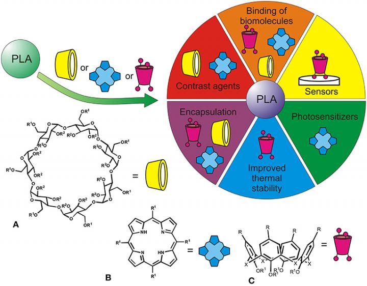 image: Applications of PLA functionalized with macrocyclic structures [β-cyclodextrins (A), tetrapyrroles (B), calixarenes (C), R1, R2 indicate possible modification by PLA fragments].