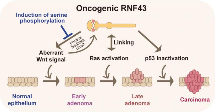 image: Oncogenic RNF43 which induces aberrant activation of Wnt signaling and suppression of an important tumor suppressor gene p53 at the same time, interacts with active Ras in a multi-step carcinogenesis process (Tadasuke Tsukiyama, et al., Nature Communications, September 15, 2020).